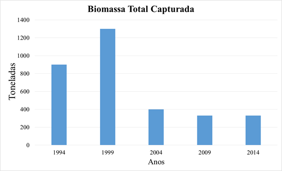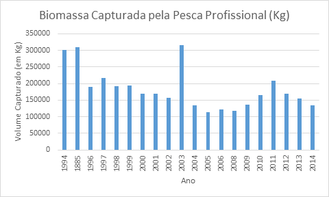 Figura 03. Quantidade de pescado capturado (em Kg) pela pesca profissional na Bacia do Alto Rio Paraguai MS, no período de 1994 a 2014, segundo dados do SCPESCA/MS.